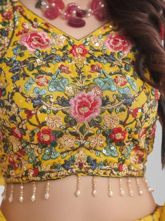 - Choli adorned with intricate embroidery, stone and mirror work for a rich festive look.