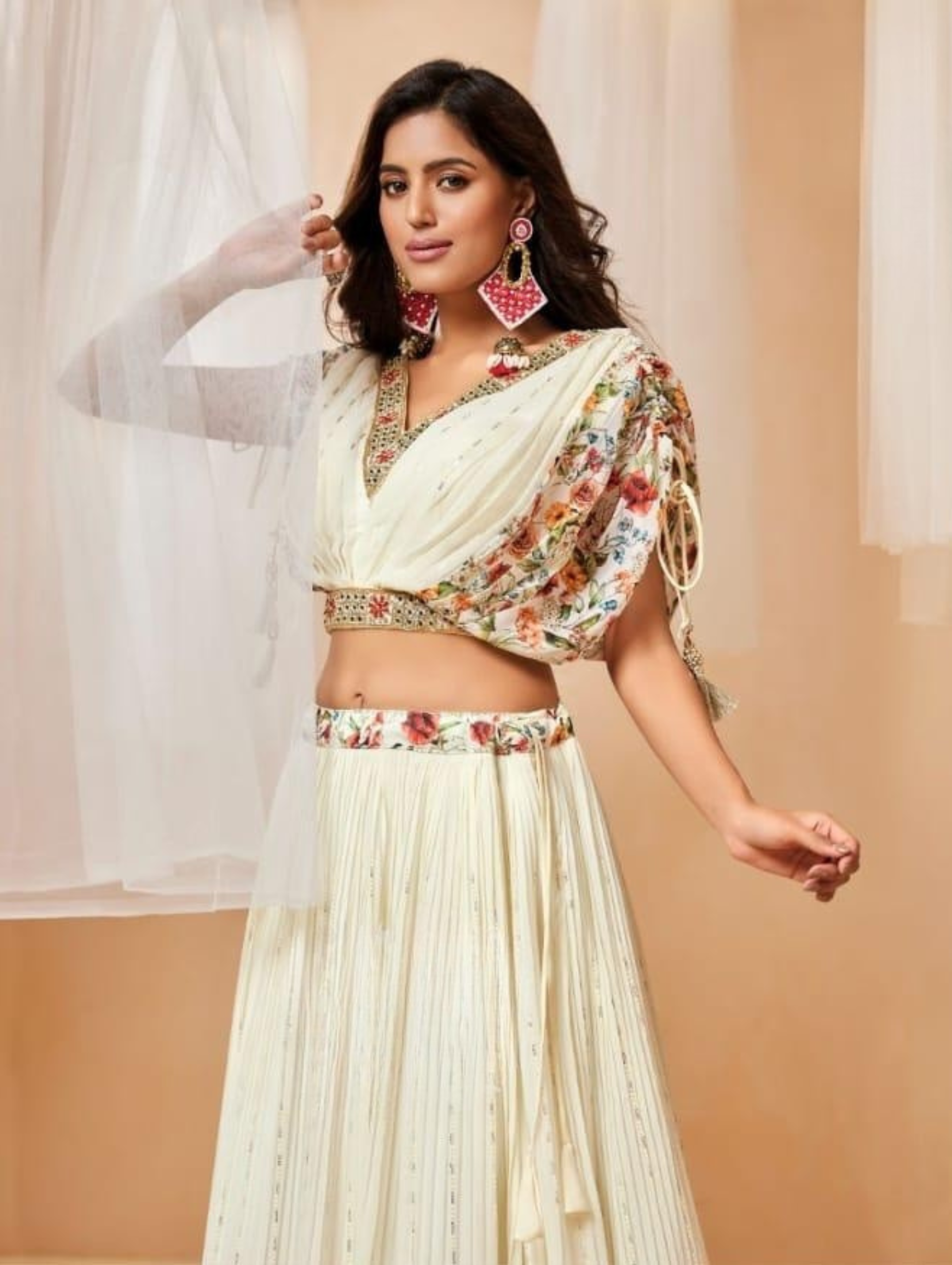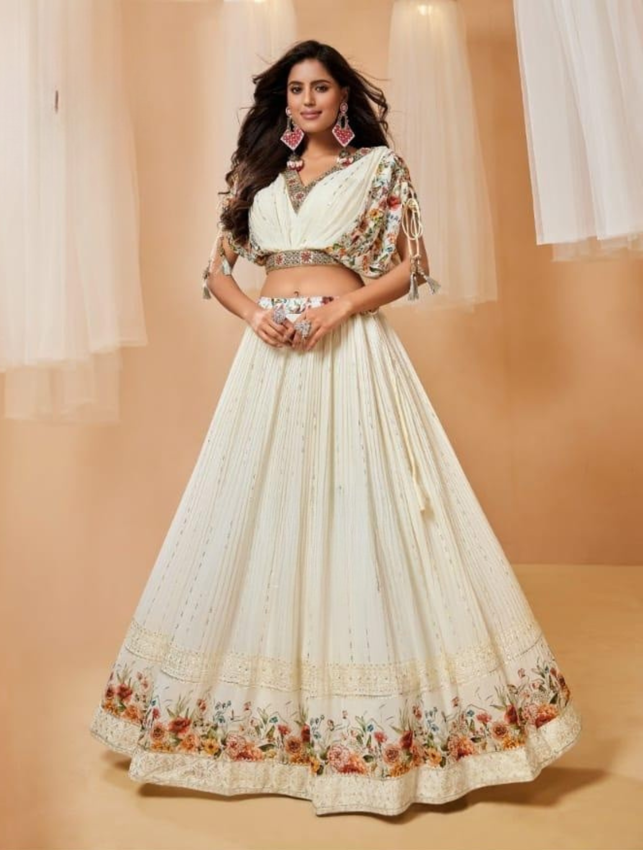 • Georgette cape-style readymade lehenga choli from the latest collection featuring elegant handwork and a very stylish design.