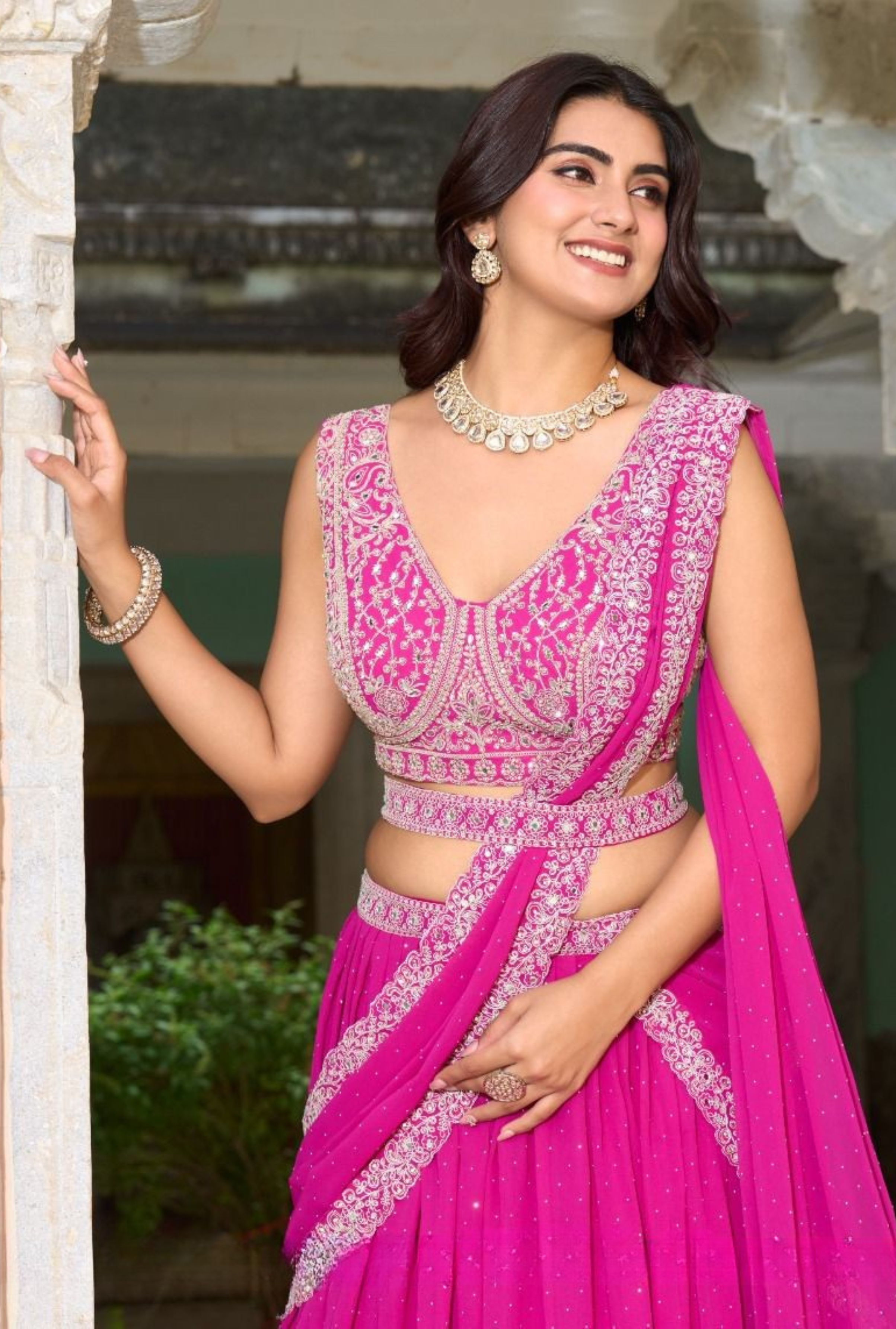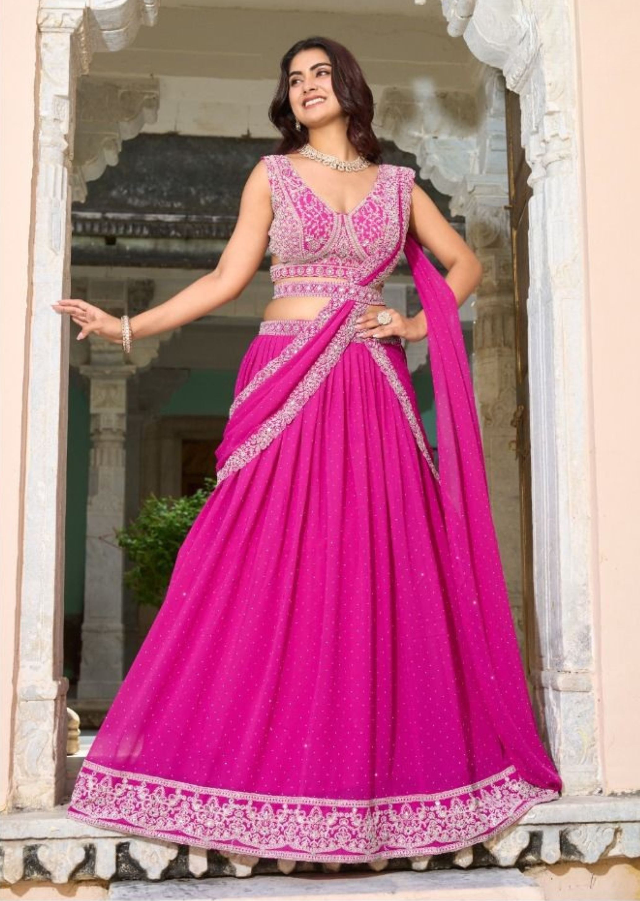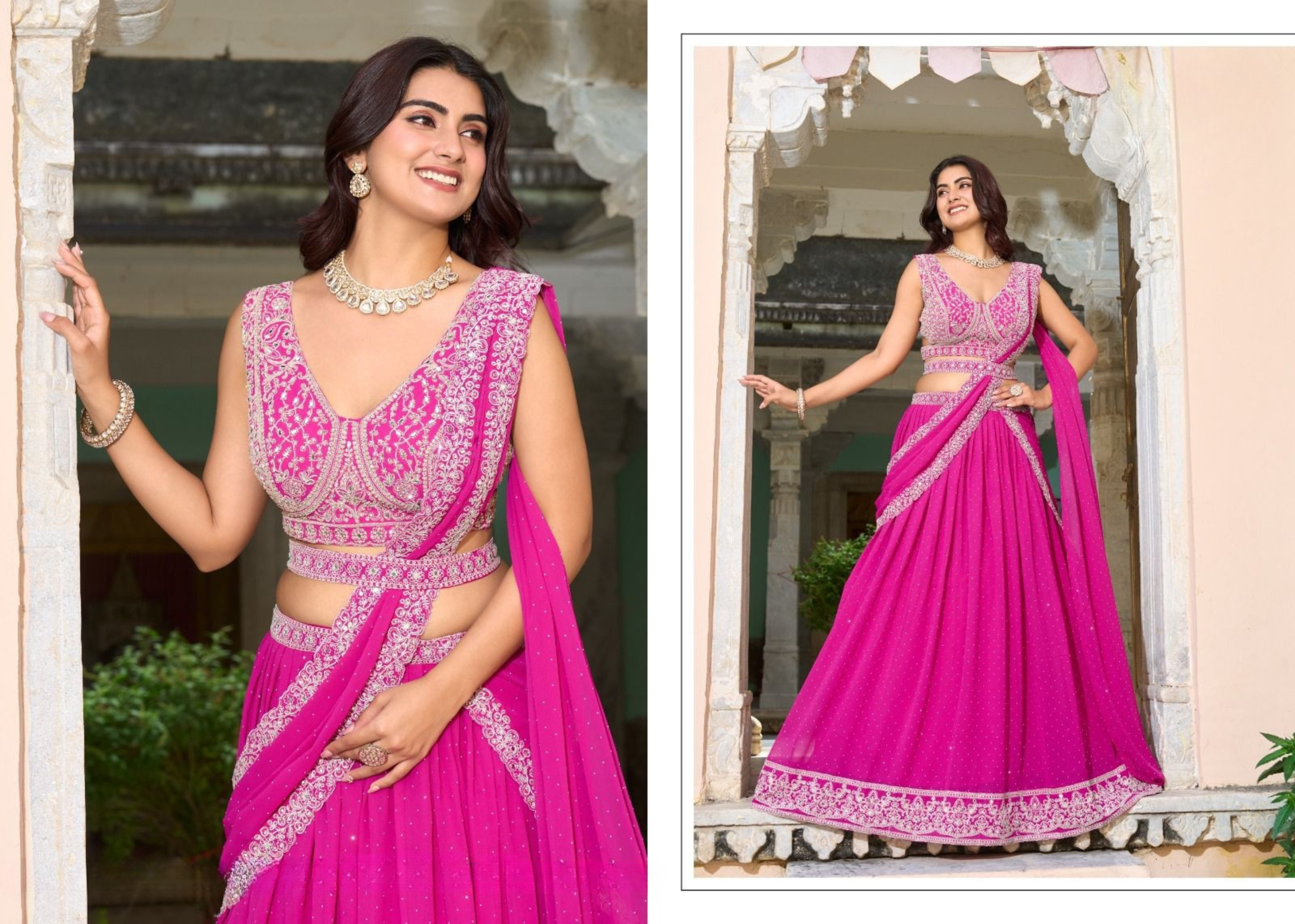 - Rani Pink Georgette Readymade Lehenga Saree with a stylish designer blouse.
