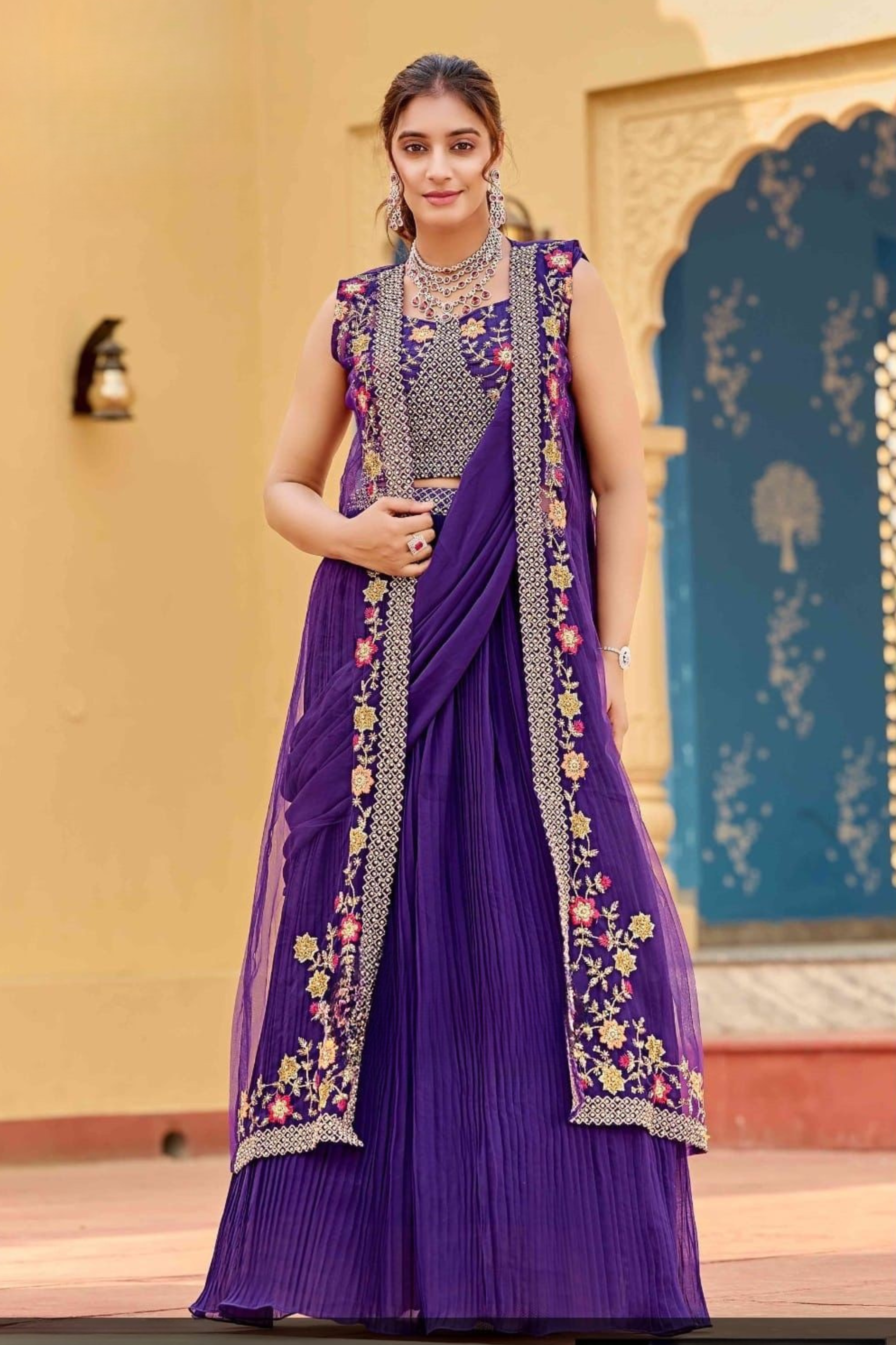 • Stylish jacket-style readymade lehenga choli with saree-inspired drape.