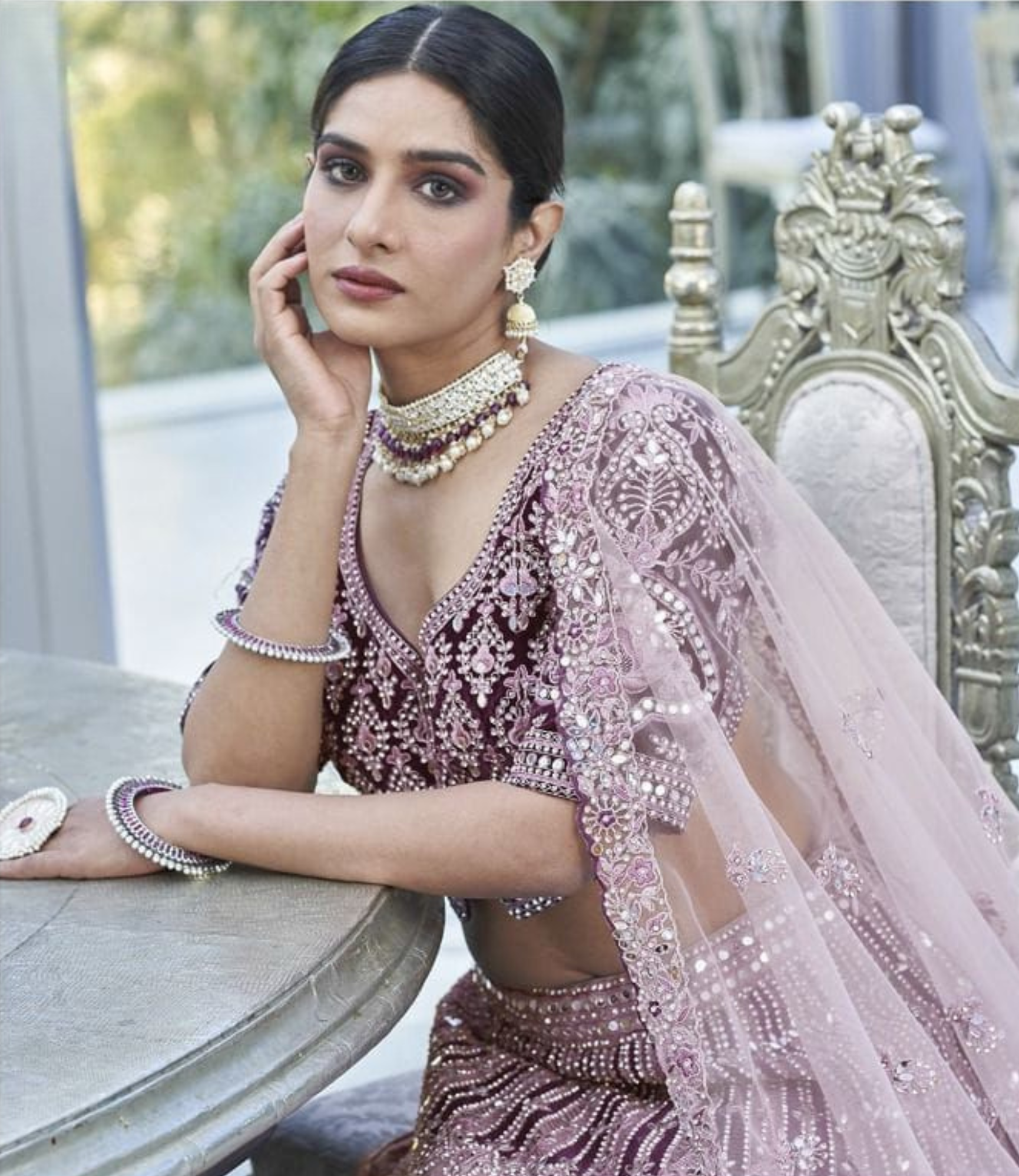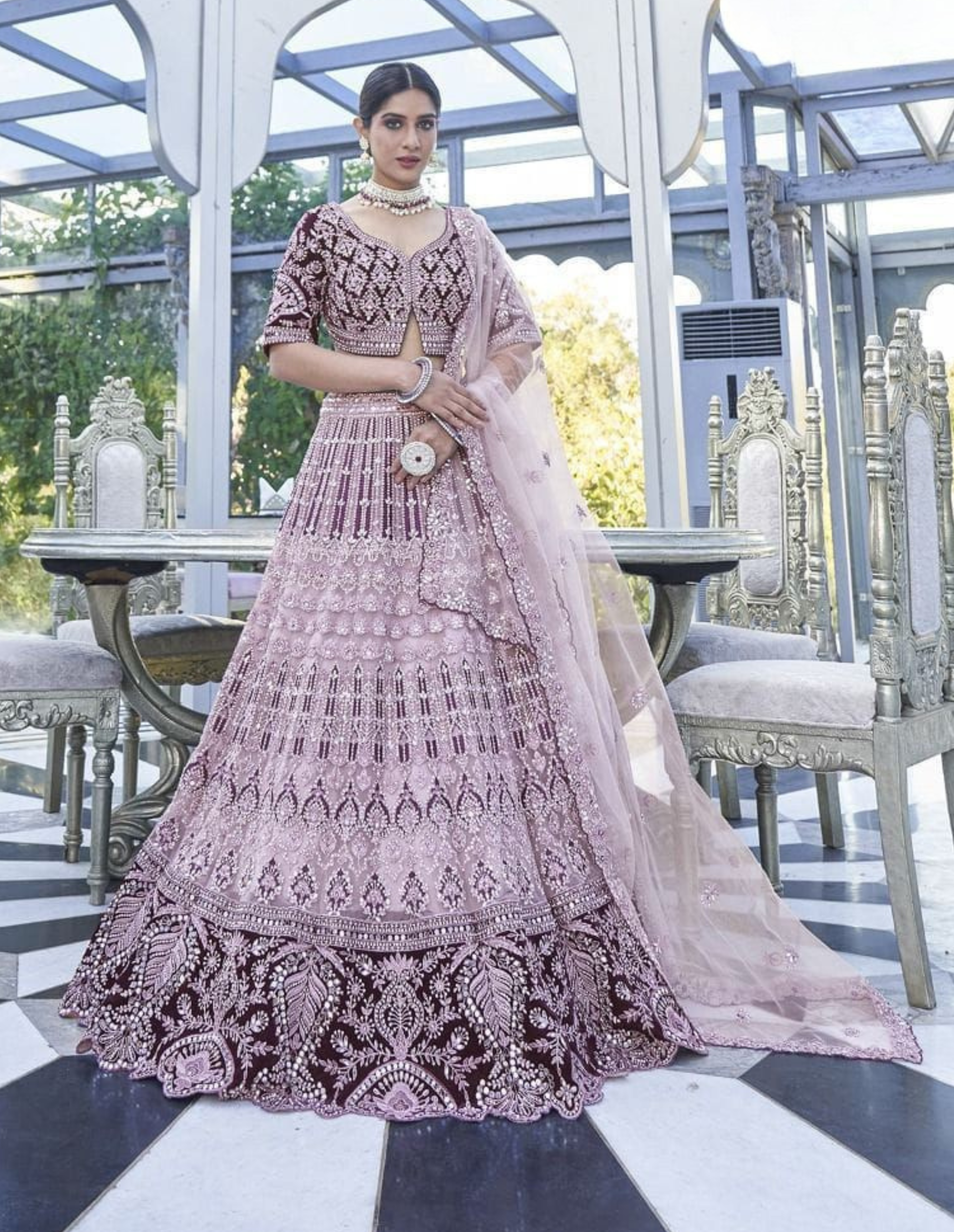 - Elegant lilac and wine purple combination with rich velvet border detailing.