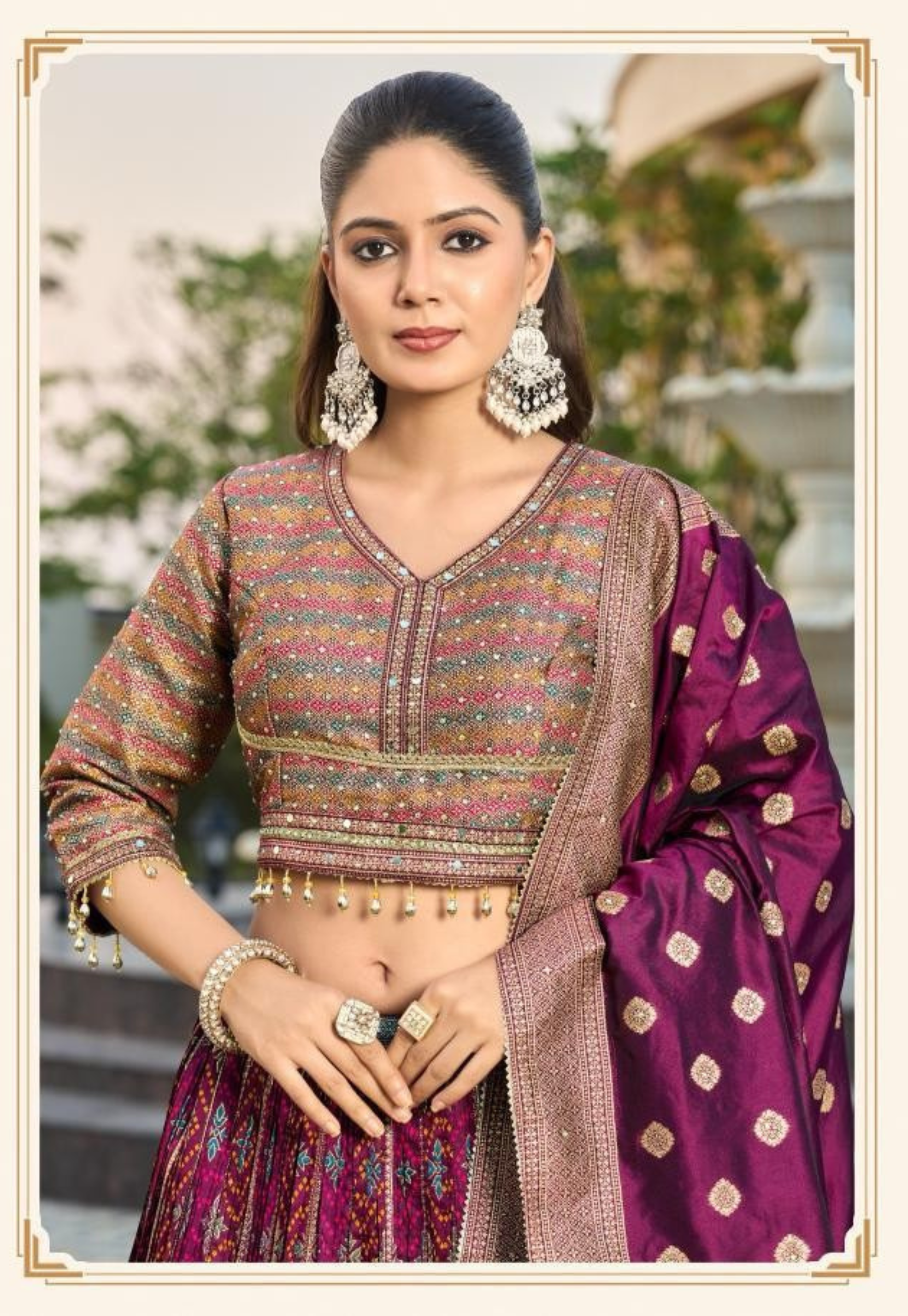 - Intricate multicolor zari weaving enhanced with embroidery, mirror work and stone detailing.