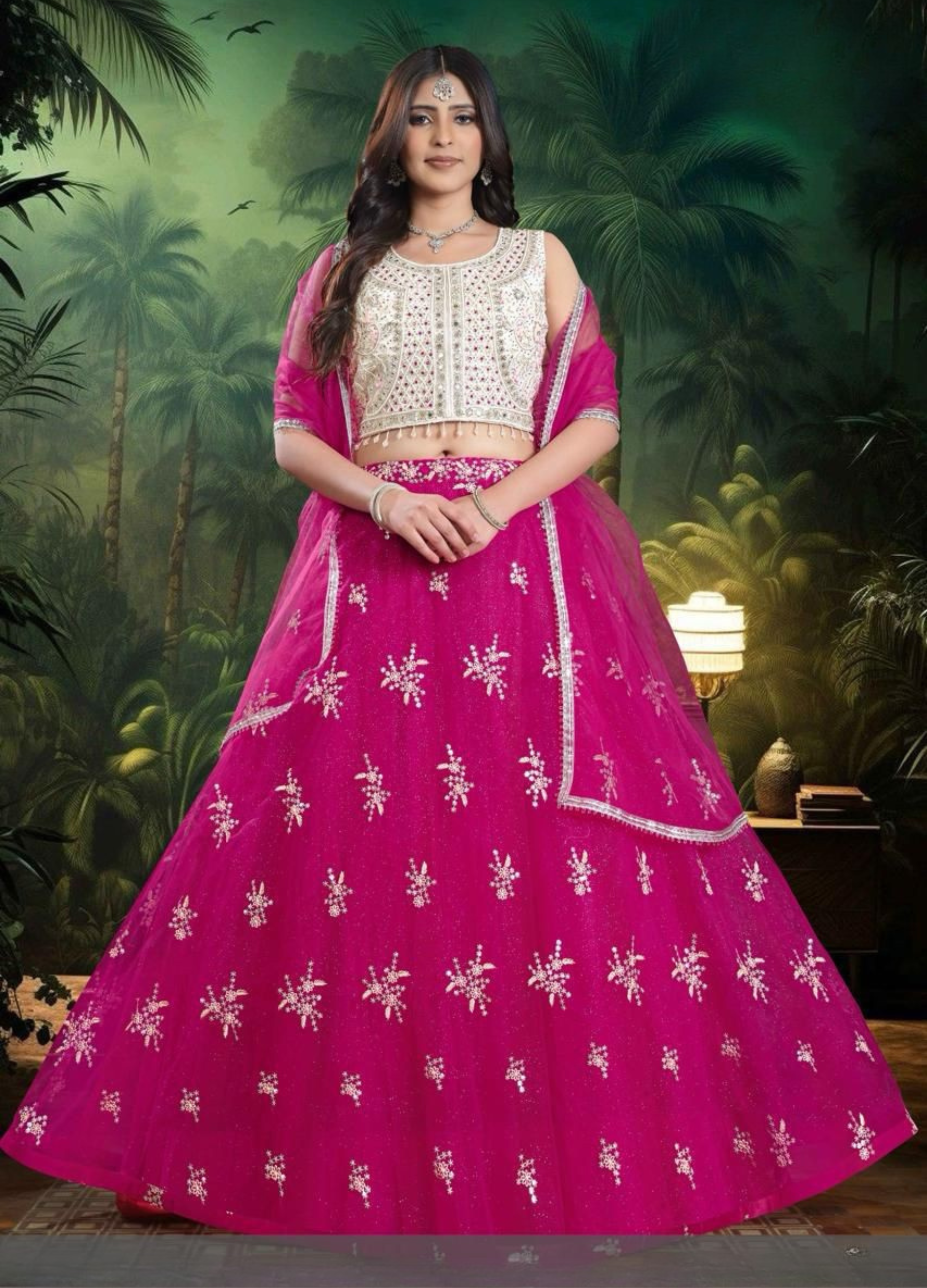 - Netting readymade lehenga choli adorned with elegant fine pearl work.
